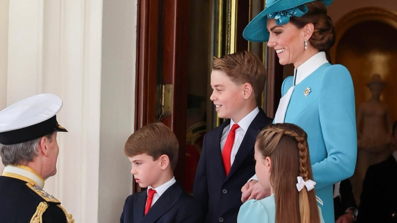 Шарлотта присоединилась к праздничной колонне вместе с мамой и двумя братьями – в карете. Она была одета в нежное голубое платье с белыми элементами, а к ней прикреплена брошь, имеющая историческое значение. Украшение когда-то принадлежало королеве Елизавете II, а еще раньше – ее матери.