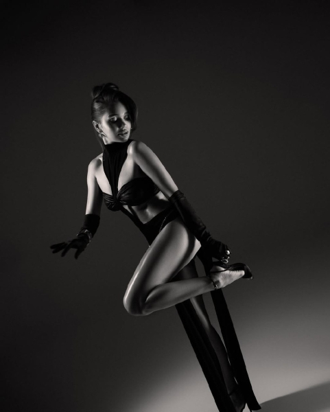 Цього разу блогерка посвітила формами у чорній сукні з відкритими ногами, раменами і талією.